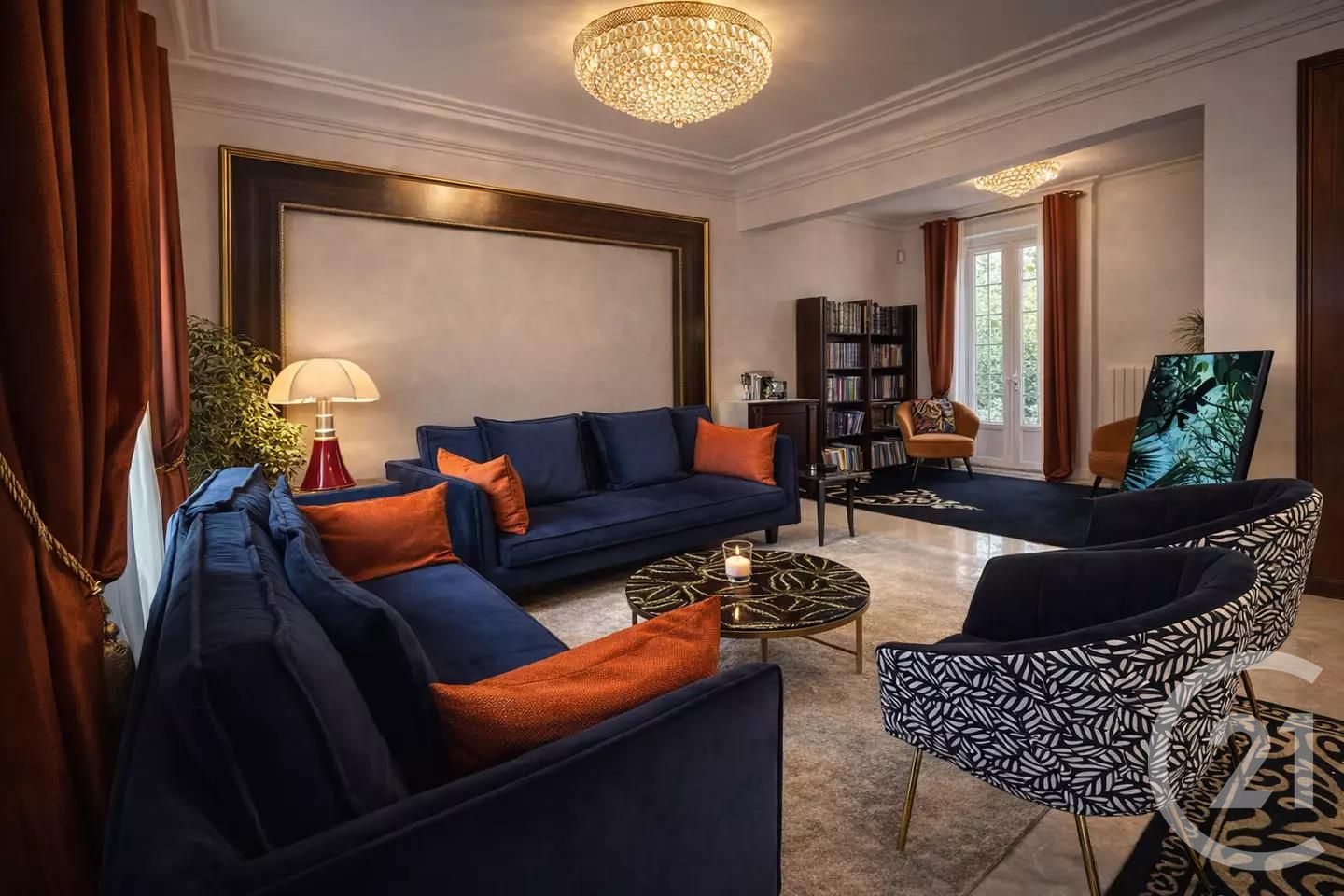 Pièce de vie lumineuse de 55 m², moulures et modernité, accès jardin (gazon synthétique récent)